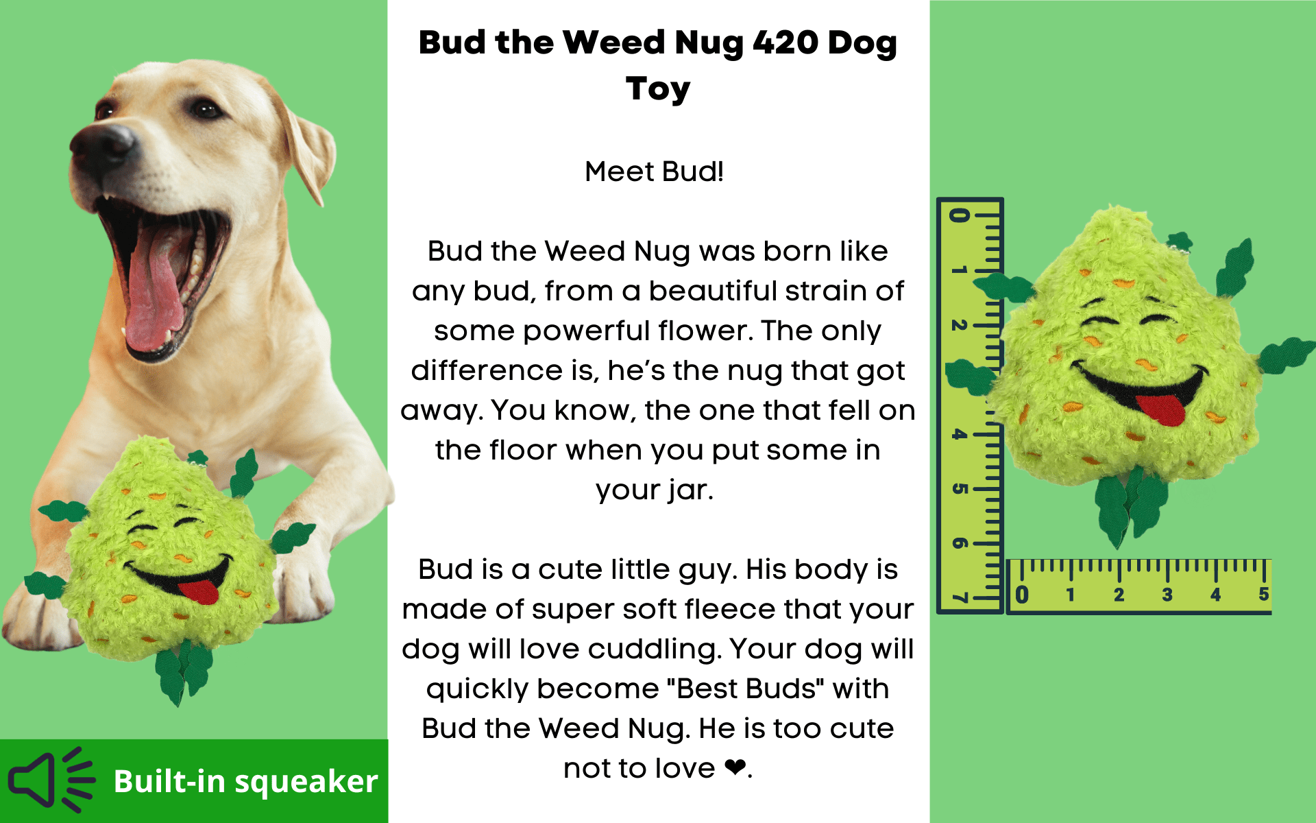 Meet Bud! He is a cute little guy about 6" tall and 4" wide. He has a built-in squeaker and is great for light play. Better yet; for Instagram pics and video of your pet with his own "bud". Your dog will love joining you for 4:20!