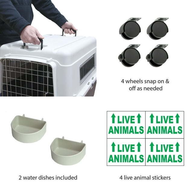This is a plastic kennel designed for a lifetime of use. Our plastic crate will be your 'go to' everyday home crate and Travel kennel. Sizing for help sizing your dog and to ensure you buy the correct size kennel. We also had airline travel in mind when designing this kennel. We include everything you need should you chose to ever fly with your dog. Check out our video for a quick tour of kennel features. Crate/ kennel assembly is fast and easy. Locking snaps hold the kennel halves together; additional included metal hardware locks the kennel together giving you peace of mind that your crate will make it'safe and secure. Some dogs chew their escape through plastic ventilation holes. We use metal slats to mitigate the chewing problem and keep your pet safe. Accident moat pulls spills away from your pet’s body, out to the edges of the kennel and a strong metal kennel door with a smooth, easy-to-grasp latch thick impact resistant poly shell can take a wallop and keep on going. Pet parents should check with their airline before a trip. Airline and cargo carrier rules vary between countries and airlines. Pet crating and kennel shipment rules do change regularly, so be sure to check with proper authority about pet shipments, Reds, and pet certifications and immunizations before your pet’s travel date. Limit kennel time, don’t park under the sun, keep pet in ventilated areas with temperature control and air movement. For pets and intended use only.