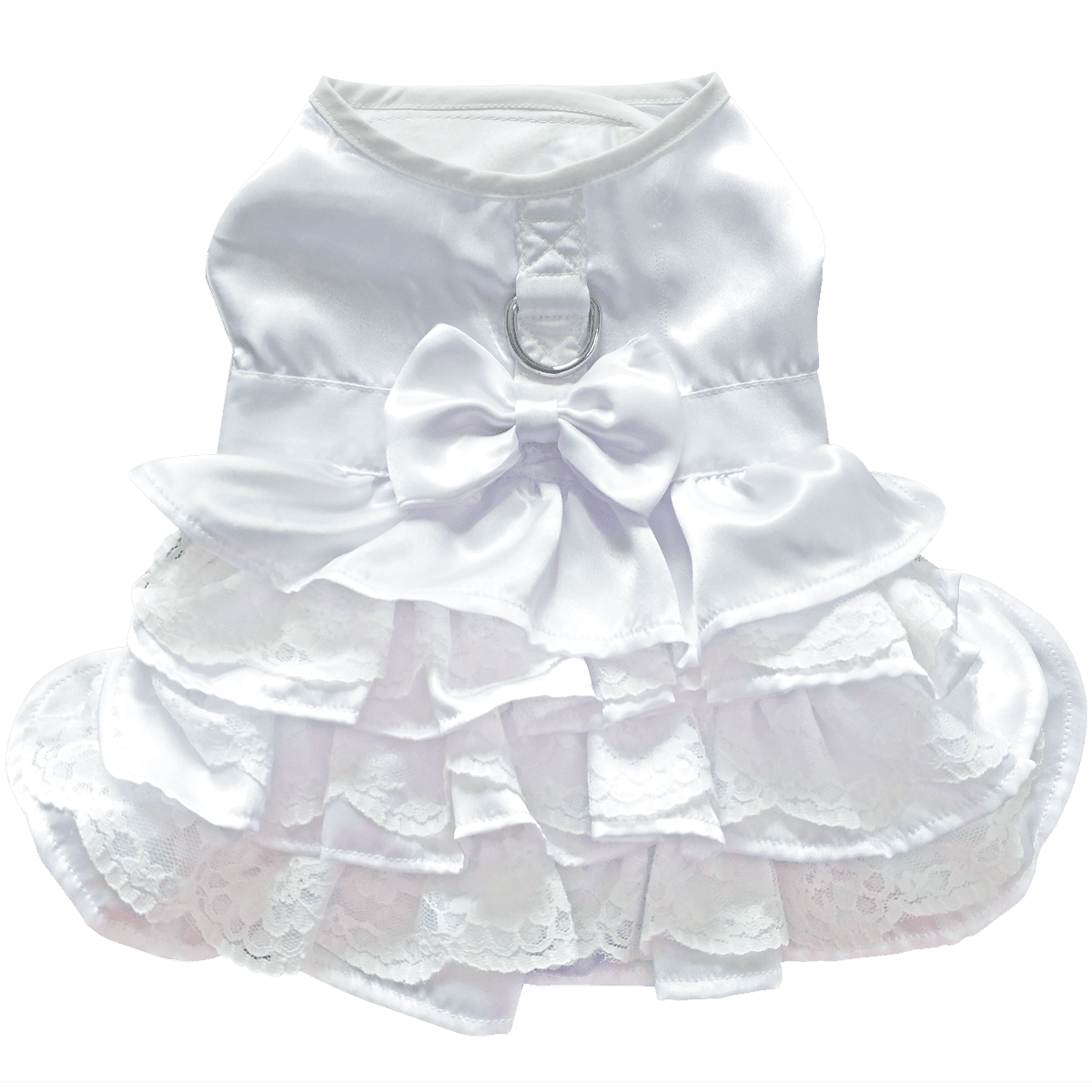 Your little bride will be so beautiful walking down the aisle wearing this elegant white satin and lace Dog Wedding Dress Set. The dress has three tiers of skirting, each with a layer of delicate white scalloped lace. The body of the dress is made from the highest quality white satin.